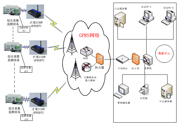 本系統(tǒng)中心服務(wù)器通過GPRS APN專線接入企業(yè)路由器,進(jìn)入GPRS APN內(nèi)網(wǎng),獲取固定IP地址。監(jiān)測點(diǎn)數(shù)據(jù)無需路由到Internet網(wǎng)絡(luò),監(jiān)測點(diǎn)DTU也采用該APN內(nèi)的SIM卡。采用這種方式組成點(diǎn)對多點(diǎn)網(wǎng)絡(luò)具有安全性高的特點(diǎn),且穩(wěn)定性高、適時(shí)性好。