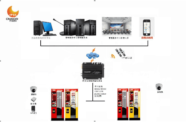 才茂3G/4G無線視頻終端設(shè)備能夠為售貨機無線數(shù)據(jù)傳輸應(yīng)用方案建立高速、穩(wěn)定的聯(lián)網(wǎng)與數(shù)據(jù)傳輸通道,將售貨信息、故障報警等通過4G無線視頻終端設(shè)備將信息傳送到監(jiān)控中心, 4G無線視頻終端設(shè)備收到監(jiān)控中心下發(fā)的命令并控制自動售貨機實現(xiàn)各種指令。同時,運營企業(yè)通過M2M云管理平臺能夠?qū)崿F(xiàn)對分散在不同地點的自助售貨終端進行統(tǒng)一的運行狀態(tài)監(jiān)管,有效降低企業(yè)的運維成本。 才茂公司根據(jù)所研發(fā)的產(chǎn)品有如下應(yīng)用方案: