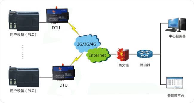 本方案中整個(gè)系統(tǒng)由用戶設(shè)備、無(wú)線數(shù)據(jù)傳輸設(shè)備(DTU)、服務(wù)器三大主要部分組成,如下圖所示。服務(wù)器通過(guò)Internet網(wǎng)絡(luò)、GPRS/CDMA網(wǎng)絡(luò)與無(wú)線數(shù)據(jù)傳輸設(shè)備(DTU)建立連接,無(wú)線數(shù)據(jù)傳輸設(shè)備(DTU)又通過(guò)串口(RS-232/485/422)直接與位于各個(gè)工業(yè)現(xiàn)場(chǎng)的PLC相接,以實(shí)現(xiàn)對(duì)PLC遠(yuǎn)程控制。