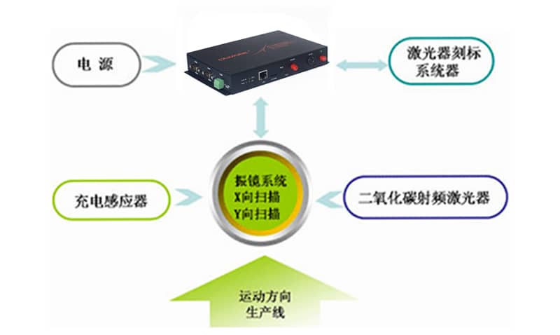 電源接220V(50Hz)分別給工控機和CO2射頻激光器供電,通過打標(biāo)軟件,工控機控制打標(biāo)控制器和振鏡系統(tǒng)。當(dāng)需要打標(biāo)的物體在生產(chǎn)線上運動時,光電感應(yīng)器捕捉到物體的運動,返回信號給打標(biāo)控制器,打標(biāo)控制器在將信號返回給工控機。工控機得到信號后,發(fā)出信號給振鏡系統(tǒng)和二氧化碳射頻激光器,振鏡系統(tǒng)調(diào)整X向和Y向振鏡,射頻激光器向X和Y振鏡發(fā)出光束,偏轉(zhuǎn)致需要打標(biāo)的物體上。