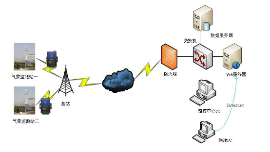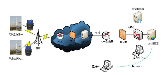 高速公路氣象采集系統(tǒng)是由安裝在高速公路沿線的各個(gè)氣象監(jiān)測(cè)站采集現(xiàn)場(chǎng)氣象信息,通過運(yùn)營(yíng)商網(wǎng)絡(luò)將監(jiān)測(cè)數(shù)據(jù)傳輸?shù)奖O(jiān)控中心,監(jiān)控中心針對(duì)收集的數(shù)據(jù)做成相應(yīng)的分析,通過圖形或報(bào)表實(shí)時(shí)顯示氣象數(shù)據(jù),當(dāng)數(shù)據(jù)出現(xiàn)異常時(shí),發(fā)出報(bào)警信息通知管理人員。
