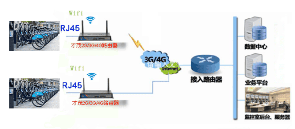 公共自行車租賃無線數(shù)據(jù)應(yīng)用拓?fù)鋱D(才茂2G/3G/4G路由器+wifi)