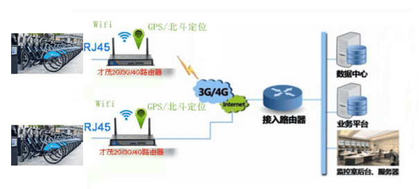 公共自行車租賃應(yīng)用拓?fù)鋱D(才茂2G/3G/4G路由器+wifi+GPS定位)