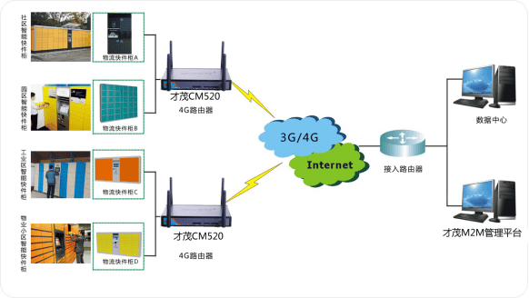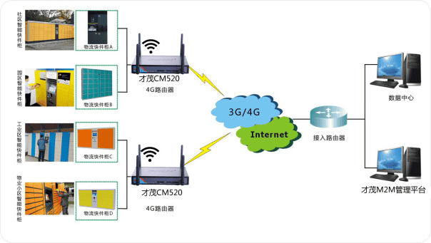 才茂自助快遞柜無線聯(lián)網(wǎng)管理系統(tǒng)由物流快遞箱、路由器和第三方M2M云管理平臺三部分組成。其中,物流存儲終端包括讀寫控制器、電子鎖、存物柜組成,人們可以在任何時(shí)間通過快遞業(yè)務(wù)員提供的密碼在智能快件箱中提取自己的快遞、包裹,同時(shí)還可以將需要寄送的快遞和包裹投遞到自助快遞柜中等待業(yè)務(wù)員前來取件。才茂CM520-8路由器能夠?yàn)樽灾爝f柜系統(tǒng)建立高速、穩(wěn)定的聯(lián)網(wǎng)與數(shù)據(jù)傳輸通道,將所有取、投件等信息傳輸?shù)狡髽I(yè)后臺,供運(yùn)營企業(yè)進(jìn)行業(yè)務(wù)分析和操作。同時(shí),運(yùn)營企業(yè)通過第三方M2M云管理平臺能夠?qū)崿F(xiàn)對分散在不同地點(diǎn)的快遞箱終端進(jìn)行統(tǒng)一的運(yùn)行狀態(tài)監(jiān)管,有效降低企業(yè)的運(yùn)維成本。