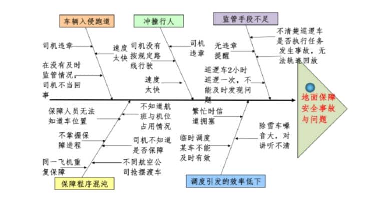 對于本機場地面保障安全事故問題進行分析和識別,使用魚刺圖整理出如下: