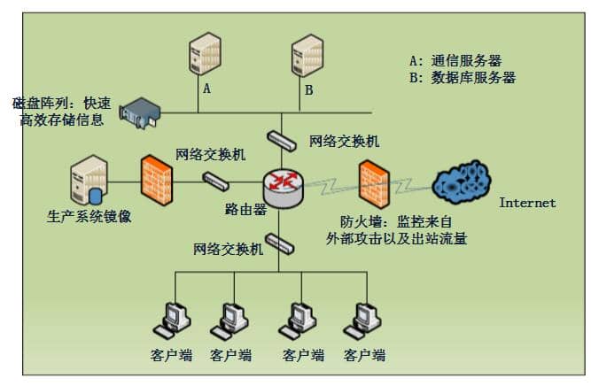 由通信服務(wù)器和數(shù)據(jù)庫服務(wù)器組成服務(wù)器群,磁盤陣列主要負責(zé)數(shù)據(jù)存儲和熱備份,部署在信息中心。通過網(wǎng)絡(luò)交換接、路由器接入公司內(nèi)網(wǎng),通過防火墻訪問生產(chǎn)系統(tǒng),生產(chǎn)系統(tǒng)數(shù)據(jù)僅做鏡像,不會對生產(chǎn)系統(tǒng)造成任何影響。