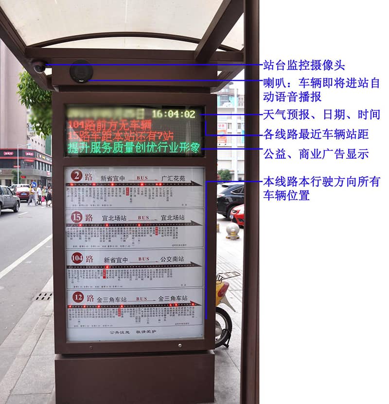 站牌上的顯示屏將用于顯示公交車輛的到站預(yù)報信息,包括線路預(yù)報、地點預(yù)報和時間預(yù)報。