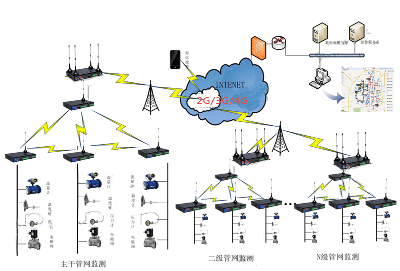 本系統(tǒng)主要有三個(gè)部分組成,分別是前端數(shù)據(jù)采集監(jiān)控,組網(wǎng)采集傳輸及后臺(tái)管理控制中心。前端數(shù)據(jù)采集監(jiān)控主要由流量計(jì)、壓力傳感器、溫度傳感器和電磁閥組成,實(shí)時(shí)監(jiān)控壓力溫度狀態(tài),通過(guò)433M自組網(wǎng)分段匯總統(tǒng)計(jì)由2G/3G/4G網(wǎng)絡(luò)模塊上傳到后臺(tái)管理監(jiān)控中心,保證了熱網(wǎng)管道正常運(yùn)行;同時(shí)通過(guò)實(shí)時(shí)監(jiān)測(cè)壓力、溫度狀態(tài),保證在異常情況下可以通過(guò)遠(yuǎn)程控制電磁閥開關(guān),保證異常管道中斷供給。減少故障發(fā)生安全隱患,最大限度保證水資源和熱能資源的浪費(fèi)。