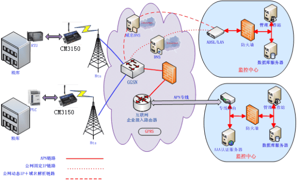 針對(duì)中央直屬儲(chǔ)備糧食倉庫監(jiān)管量大、倉庫布點(diǎn)分散、空間距離遙遠(yuǎn)和糧食監(jiān)測(cè)參數(shù)繁多等特點(diǎn),我們?cè)O(shè)計(jì)了用GPRS無線網(wǎng)絡(luò)的方式實(shí)現(xiàn)糧庫現(xiàn)場參數(shù)的數(shù)據(jù)采集和遠(yuǎn)程傳輸方案,真正實(shí)現(xiàn)了糧庫的多點(diǎn)、遠(yuǎn)程、實(shí)時(shí)、同步的現(xiàn)場數(shù)據(jù)傳輸,方便、快捷、經(jīng)濟(jì)、可靠、安全的進(jìn)行糧庫的分布式集中測(cè)控。