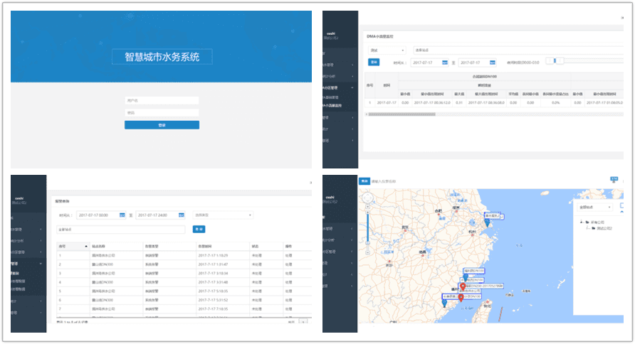DMA分區(qū)管理:DMA基礎(chǔ)管理,DMA分區(qū)管理能進(jìn)行DMA區(qū)域的添加和管理,每一個DMA區(qū)域都能進(jìn)行出水表和入水表的配置;DMA區(qū)域監(jiān)控,將DMA區(qū)域以直觀地顯示其出水量、入水量以及產(chǎn)出比;DMA小流量監(jiān)控,DMA區(qū)域的每個子表在這個時間區(qū)段內(nèi),瞬時壓力、流量,流量、壓力最大最小值,以曲線圖顯示瞬時流量、壓力數(shù)據(jù),柱狀圖來顯示累計的流量。