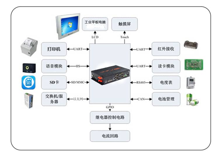 6、可靈活外接讀卡器、打印機(jī)、電度表等設(shè)備,要求產(chǎn)品具有多串口和CAN通訊,實(shí)現(xiàn)自助刷卡充電以及花費(fèi)單據(jù)打印。
