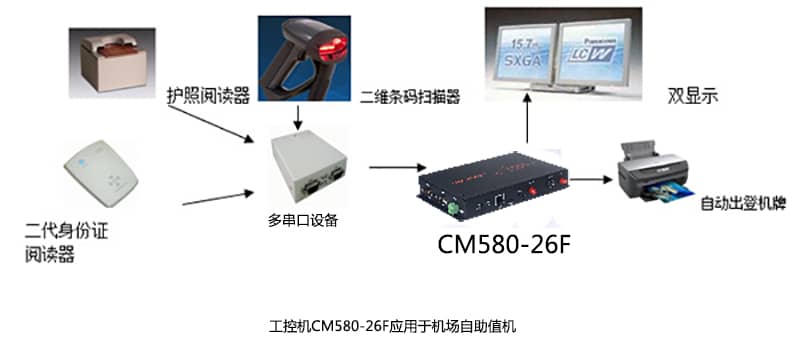 國內某機場自助值機設備系統(tǒng)就是CM580-26F整機作主控單元設備,通過網絡接口與上層交互信息,整機串口控制(二代身份證閱讀器、護照閱讀器、二維條碼掃描器、民航會員卡閱讀器等),小型打印機來打印登機牌,VGA接入的顯示屏作用戶操作界面,通過接入DVI端口來播放視頻廣告,從而達到了其商業(yè)利益的最大化,同時又節(jié)約了人力成本。