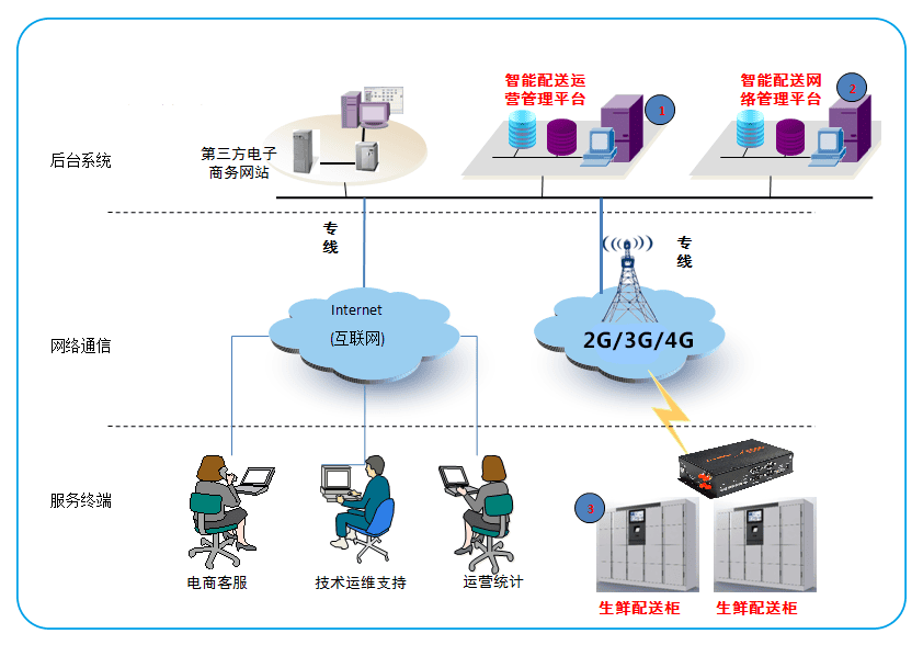 2、智能配送網(wǎng)絡(luò)管理平臺:智能配送網(wǎng)管系統(tǒng)專門負(fù)責(zé)配送網(wǎng)的運行監(jiān)控與管理,監(jiān)控包括:配送柜當(dāng)前是否在線、在線時間、上下線次數(shù)、通信異常原因等。