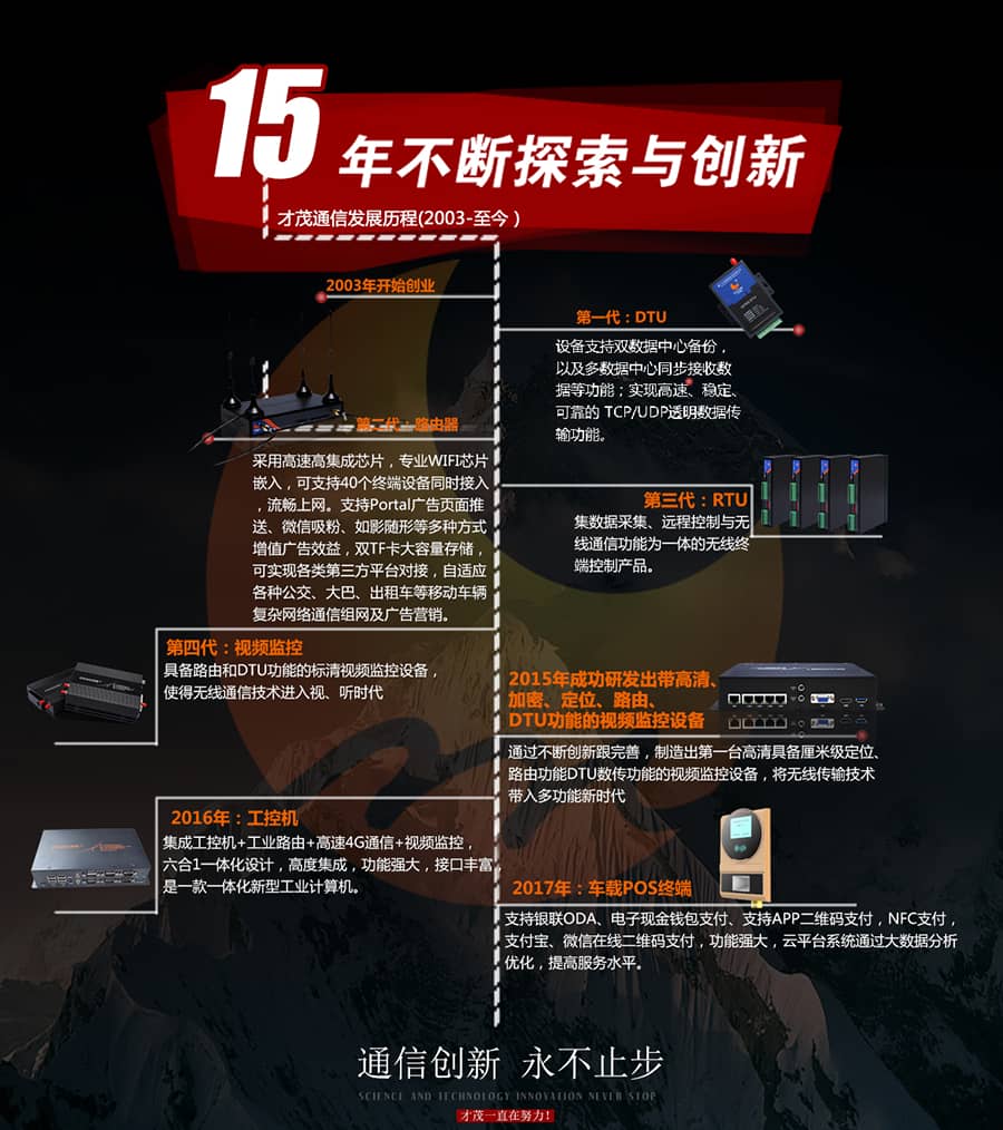 歷經(jīng)十年砥礪奮進(jìn),才茂通信作為工業(yè)級(jí)無(wú)線通信行業(yè)內(nèi)的“領(lǐng)航者”,深耕工業(yè)無(wú)線通信領(lǐng)域多年,積累了豐富的行業(yè)知識(shí)和經(jīng)驗(yàn),擁有最成熟全面的技術(shù)、產(chǎn)品優(yōu)勢(shì);專(zhuān)業(yè)提供工業(yè)級(jí)無(wú)線通信傳輸設(shè)備及提供整體解決方案,全系列高端通信設(shè)產(chǎn)品(工控一體機(jī)、工業(yè)級(jí)路由器、無(wú)線視頻監(jiān)控終端、無(wú)線RTU、無(wú)線DTU、),充分顯示才茂通信公司雄厚實(shí)力,專(zhuān)業(yè)通信設(shè)備充沛的供應(yīng)能力和才茂產(chǎn)品的廣范的適應(yīng)性。十年歷程,才茂通信發(fā)展取得今天的輝煌成就,離不開(kāi)客戶的信任、家人的關(guān)心、朋友的厚愛(ài)、供應(yīng)商合作伙伴的支持及全體員工的付出和貢獻(xiàn)。展望未來(lái),才茂通信將上下一心,邁出有勁步伐,成熟穩(wěn)重地走出下一個(gè)才茂通信的十年!攜手共同鑄就未來(lái),譜寫(xiě)才茂通信新的篇章?!?span>