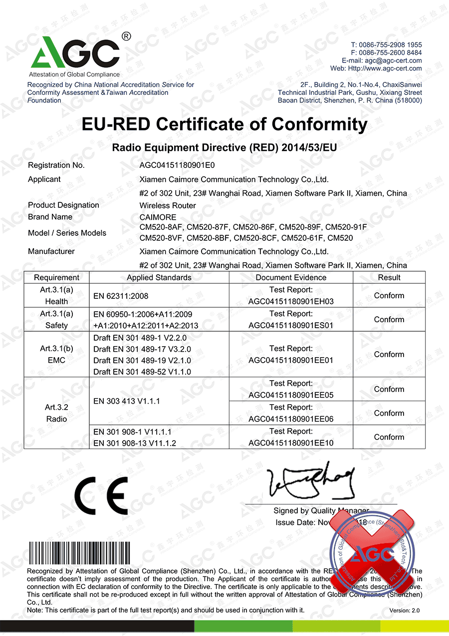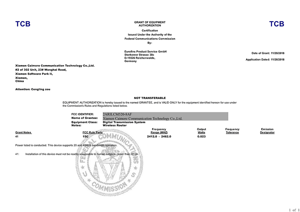 2018年11月,廈門才茂通信科技有限公司憑借嚴格的生產(chǎn)管理制度,先進的生產(chǎn)技術(shù)、優(yōu)質(zhì)的產(chǎn)品質(zhì)量,誠信為本的企業(yè)宗旨,分別獲得《美國FCC認證》《歐盟CE認證》證書。為才茂通信系列產(chǎn)品下一步走出國門開啟了通行的綠色通道。