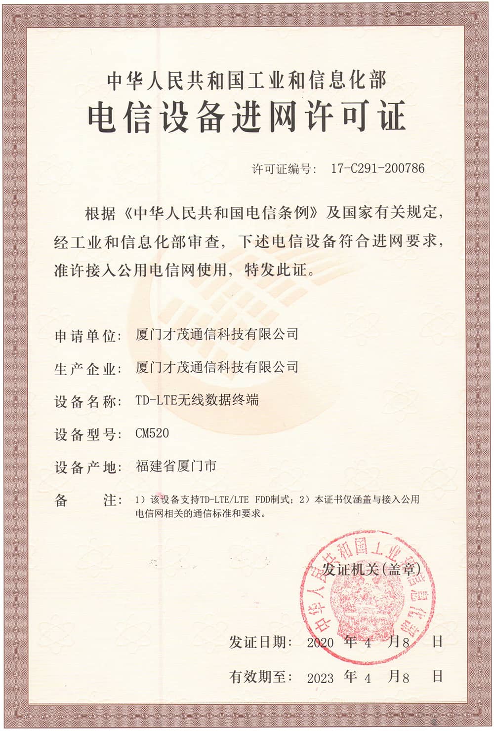 熱烈祝賀才茂通信CM520系列獲得工信部電信設備進網(wǎng)許可證
